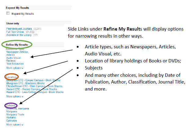 Three main search options appear at the left side of the search results. They are: